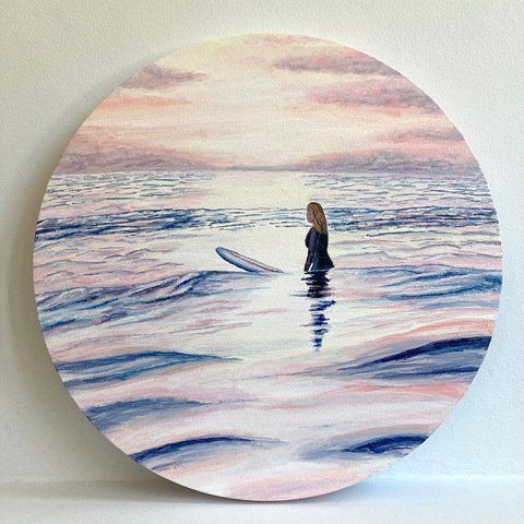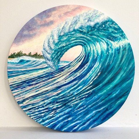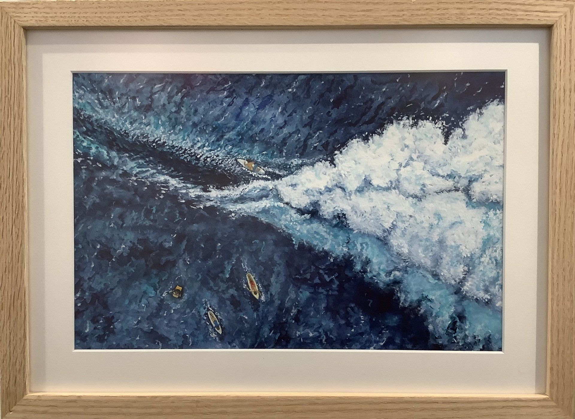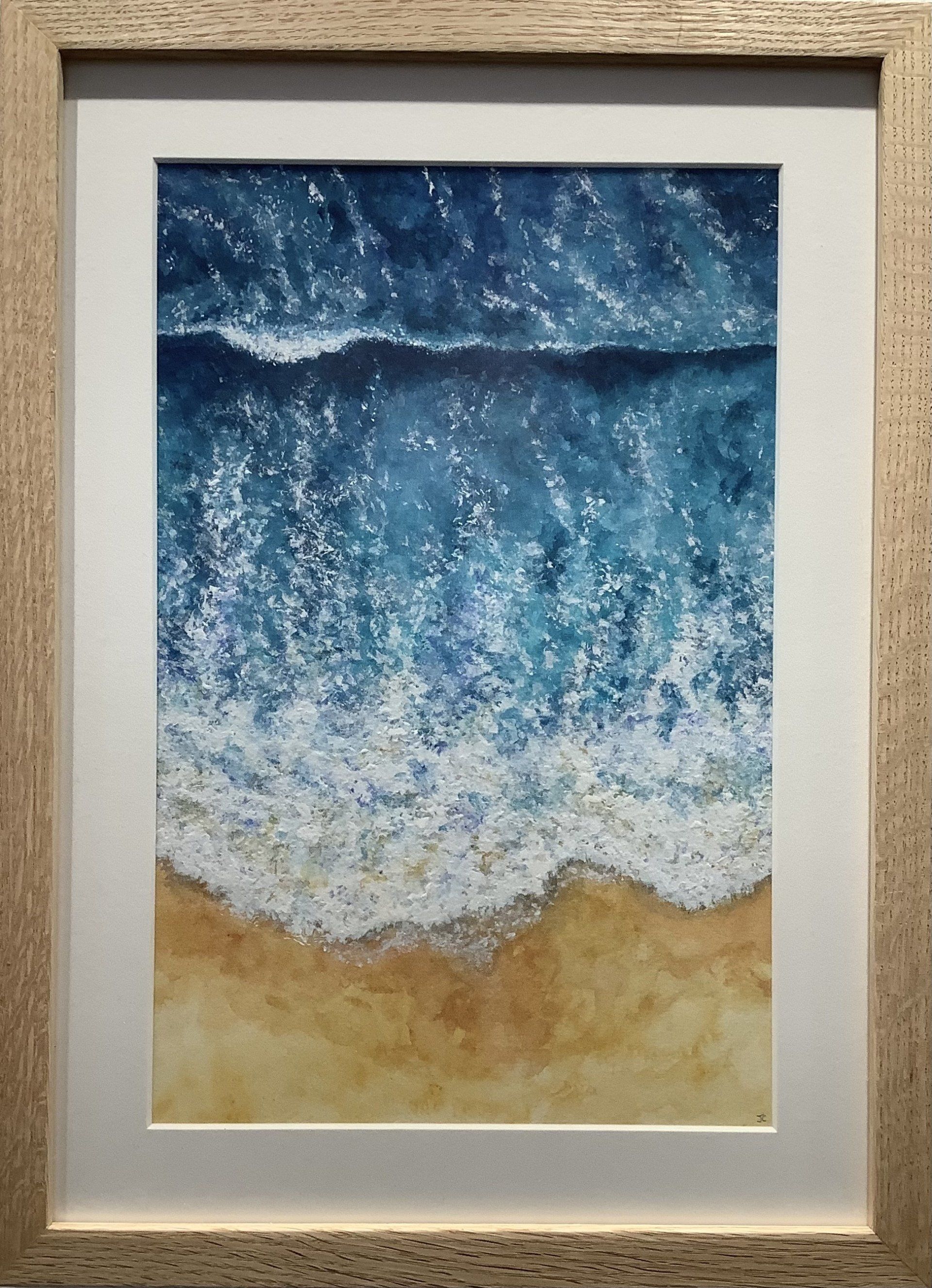 ‘I experiment with the ever changing state of the ocean, the ebb and flow of the tide, the intense and subtle colours the weather creates on and through the water. I am passionate about marine life and I use my illustration skills to represent them in my artwork. I use different mediums like watercolour, gouache and acrylics mixed with various textures to keep my work fresh. I experiment with different viewpoints of below the surface, in the curl of the wave, aerial and diving into the underwater world.