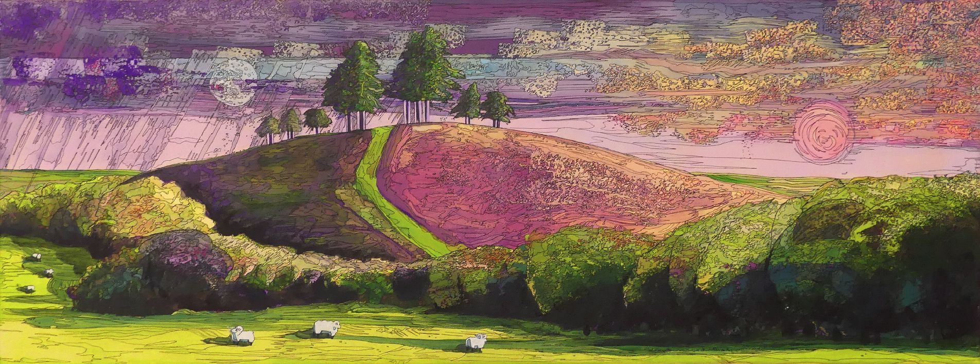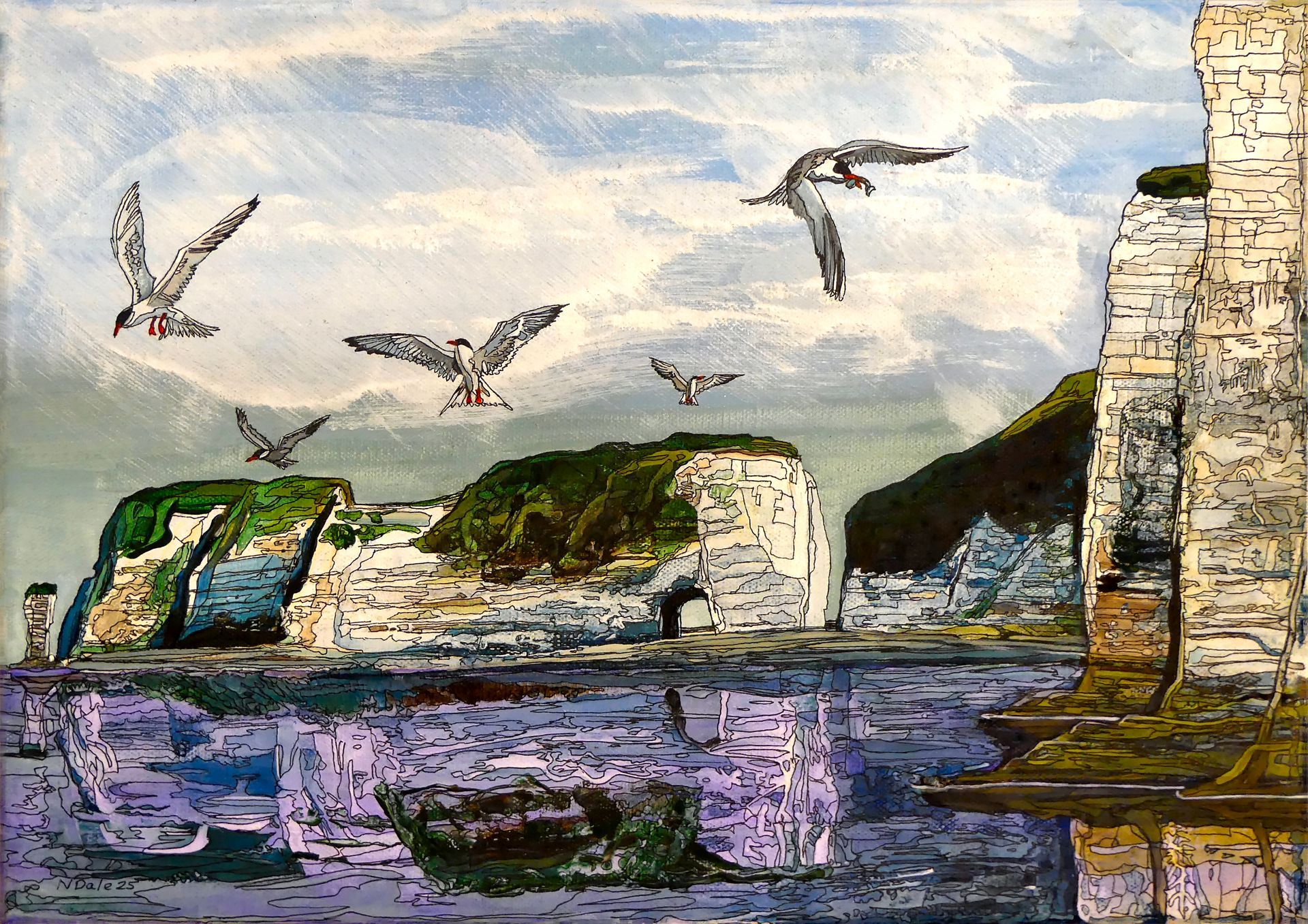 He is based near Dorchester and paints mostly in acrylic on canvas, often enhanced by the use of a pen for picking out or highlighting details.